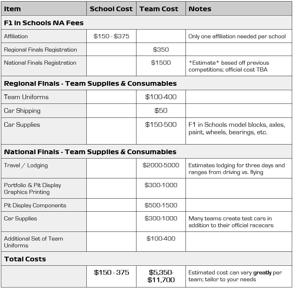 The budget per student team varies greatly from team to team. An estimated budget for the 2023/24 season is shown below (this is an example only based on previous competitors’ budgets and not set amounts; teams should create their own budget based on their needs). Student teams typically fundraise their entire budget via sponsorships, in-kind donations, and/or fundraisers.