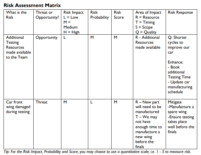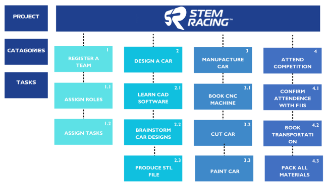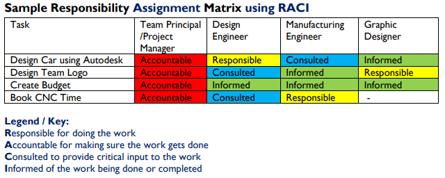 It is important to assess the strengths, skills, and abilities of each team member to effectively assign responsibilities to the best-equipped individual(s). A Responsibility Assignment Matrix (RAM) can be used to assign team members to appropriate tasks. A STEM Racing team will be very structured, the rules and regulation documents highlight the roles that a team should have. This does not limit you assigning other roles to team members.